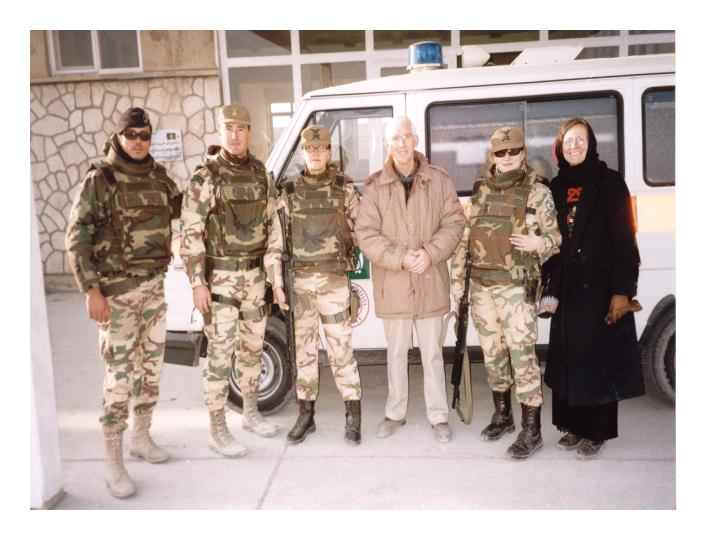 Dr. Tim Fader and his wife Patti accepting a donation from Italian coalition troops of an ambulance for Hope Hospital.