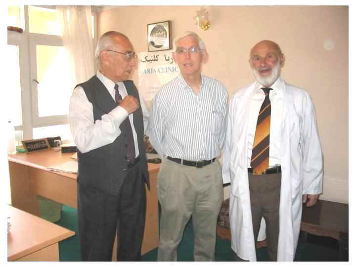 Dr. Tim Fader (center) Medical Director of the Afghan Health Consortium visiting with the Director (left) and Doctor in Charge (right) of the ARIA Medical Clinic in Kabul, Afghanistan sponsored by Help the Afghan Children, Inc.